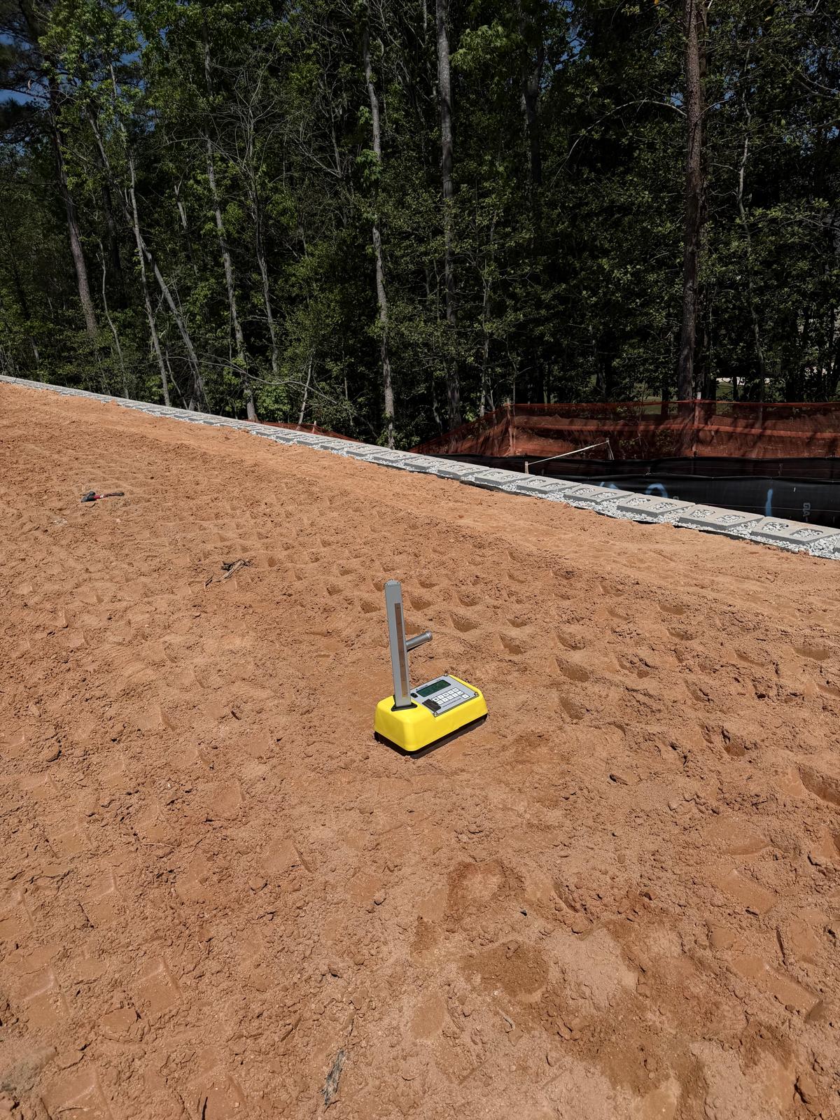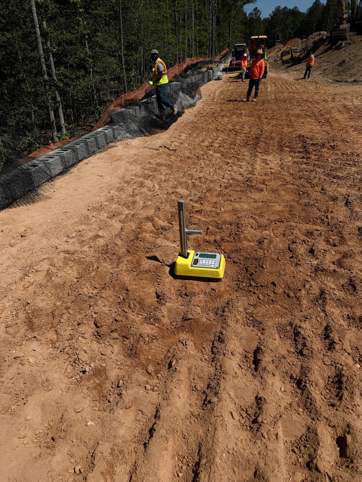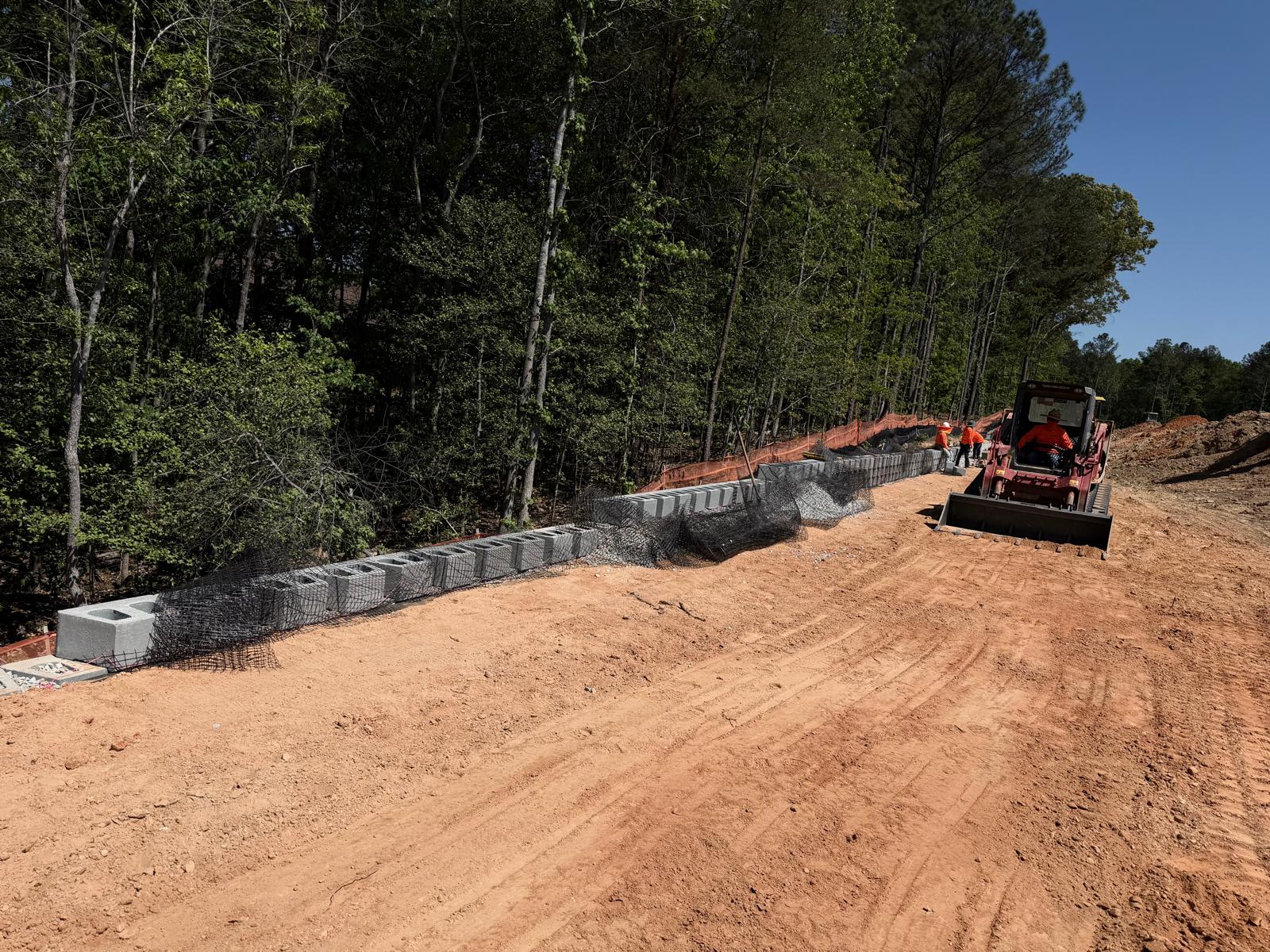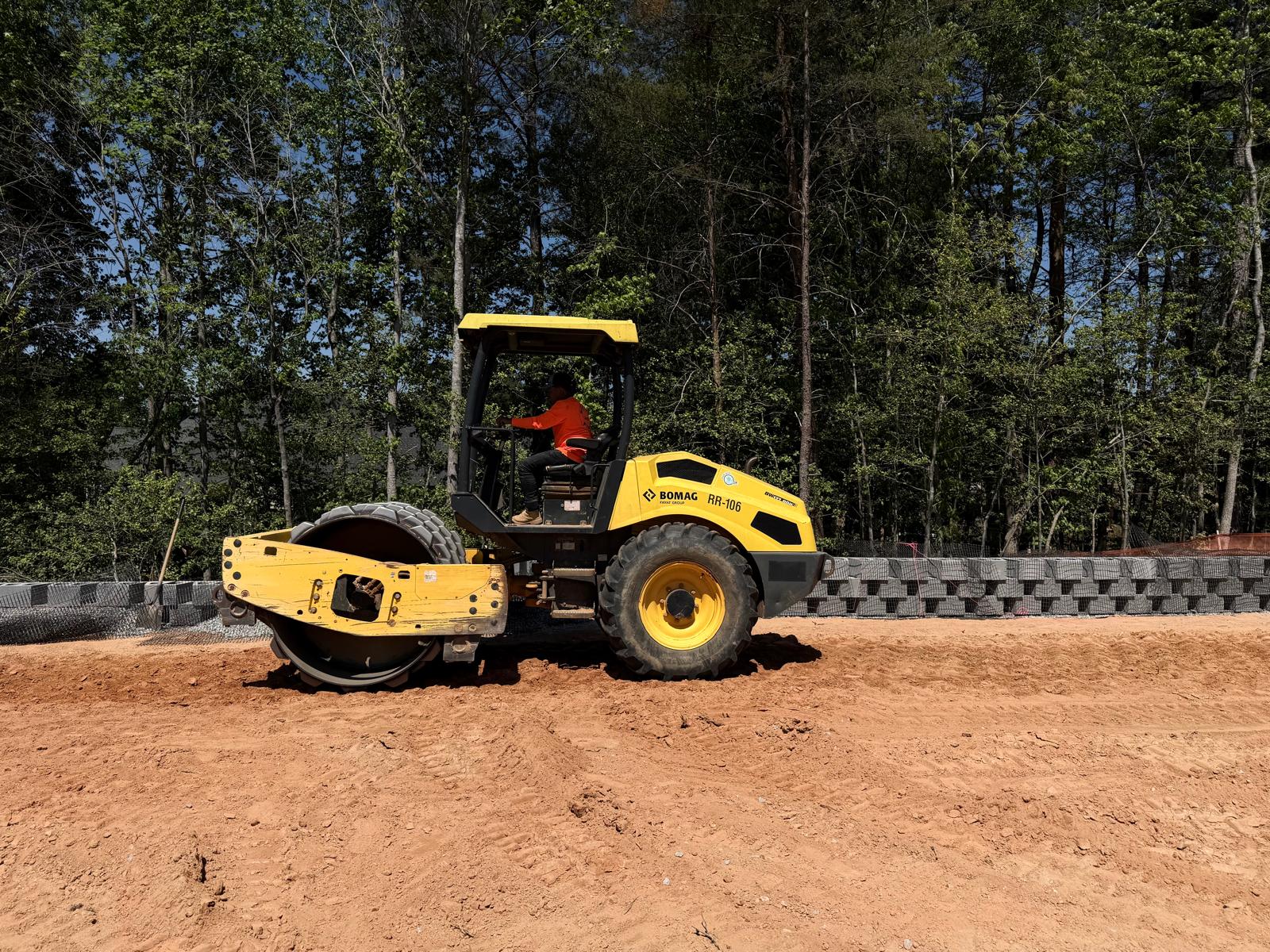 At Retaining Wall 5, the crew continued installation of CMU blocks by leveling the sub-grade and placing No. 57 stone. Geo-grid was installed as part of the soil reinforcement system. The blocks appeared to be installed in accordance with the project plans. Fill material was then placed in lifts and compacted using both a double drum roller and a sheep-foot roller.