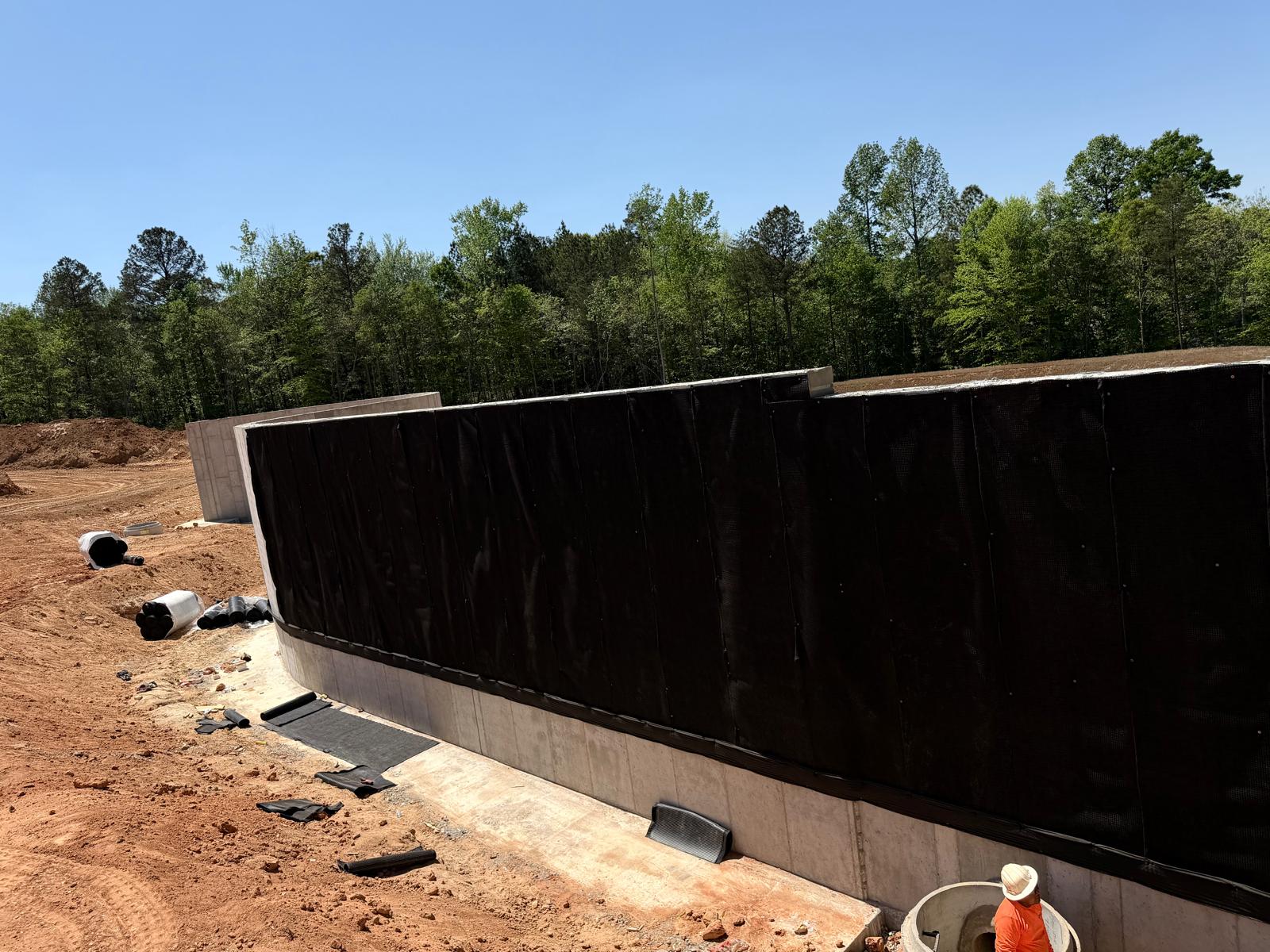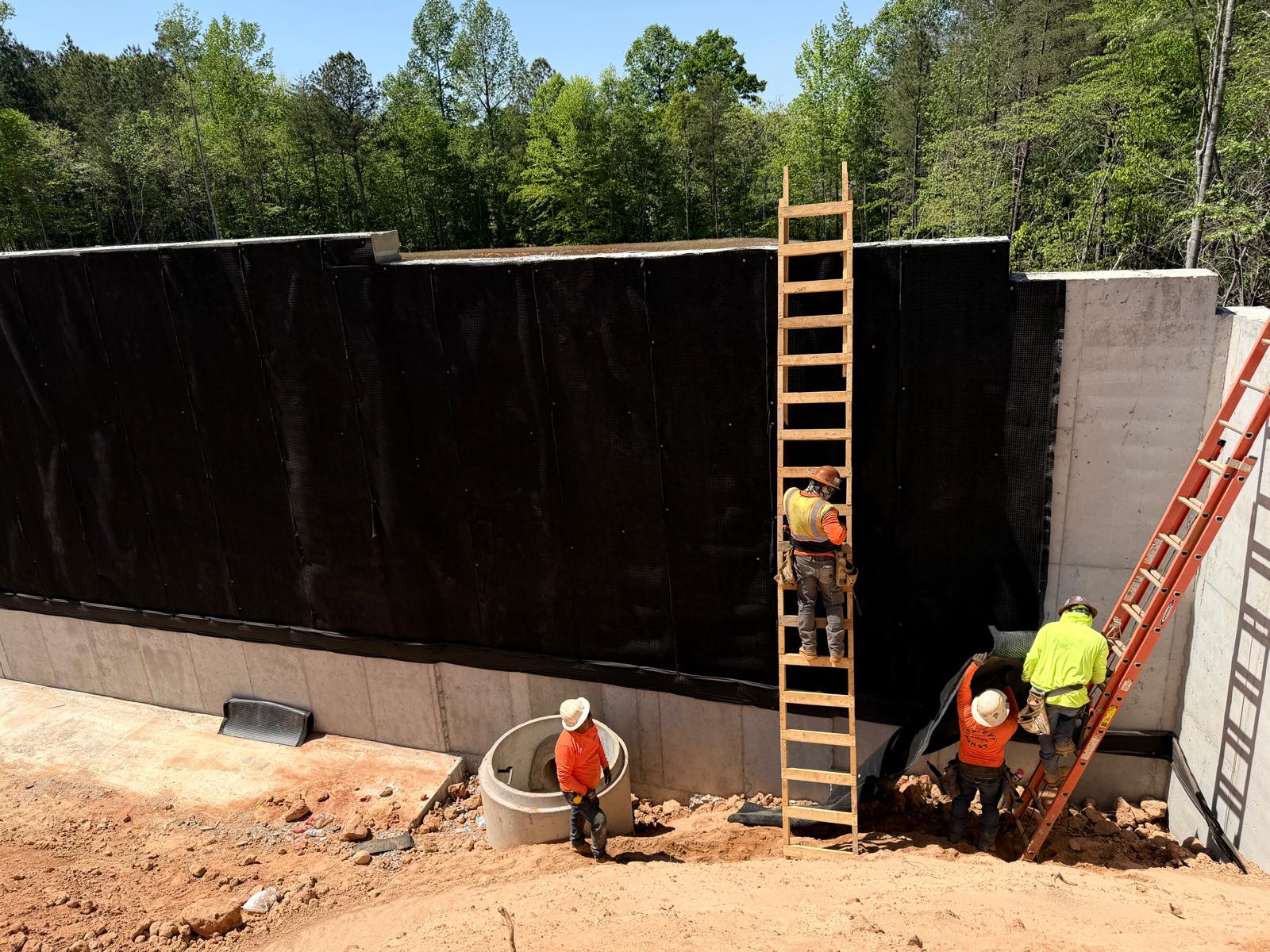 At the retaining wall, the crew installed the drainage board/waterproofing along the wall to prevent water infiltration and for drainage path.