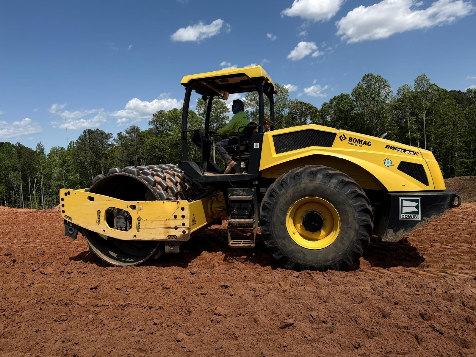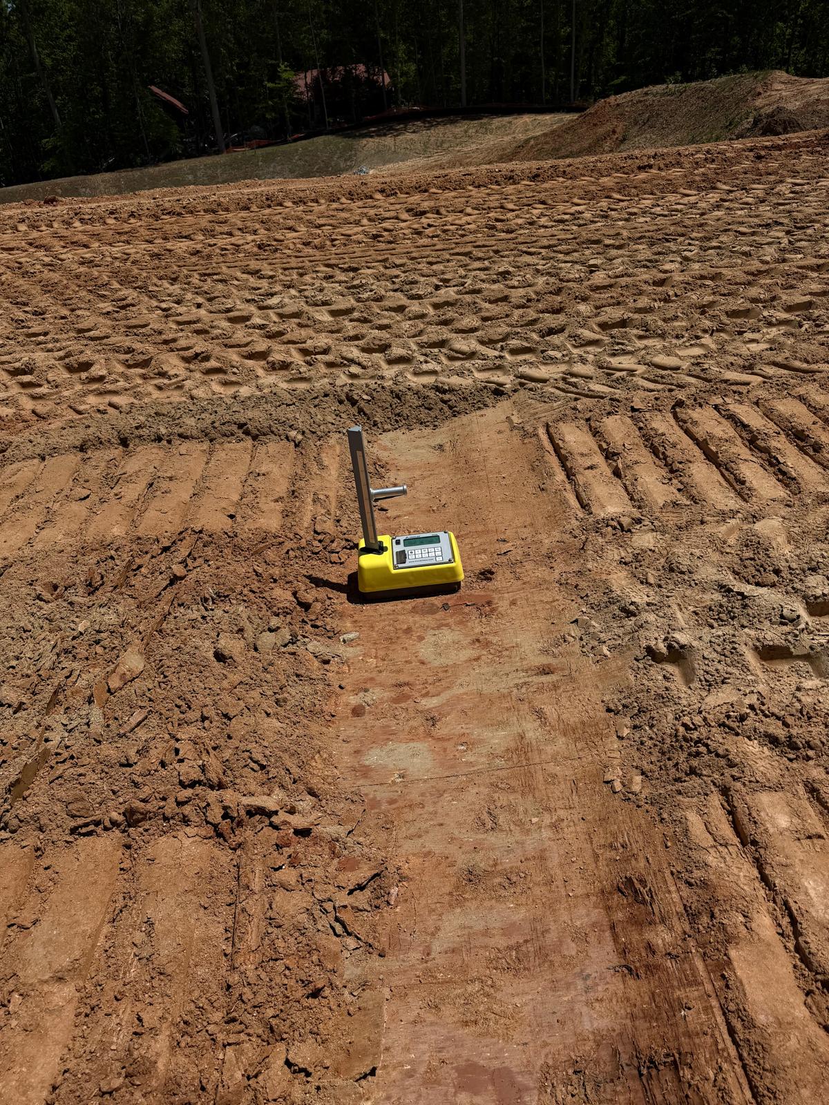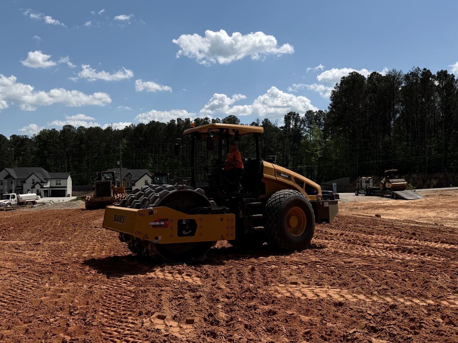 Crew continued working on Lots #62, 63, 64, and the adjacent roadway area. Fill material was placed in lifts, spread using a crawler bulldozer, and compacted using both a sheep-foot roller and a Caterpillar 815. Density tests were performed, and the results met the required project compaction specifications.