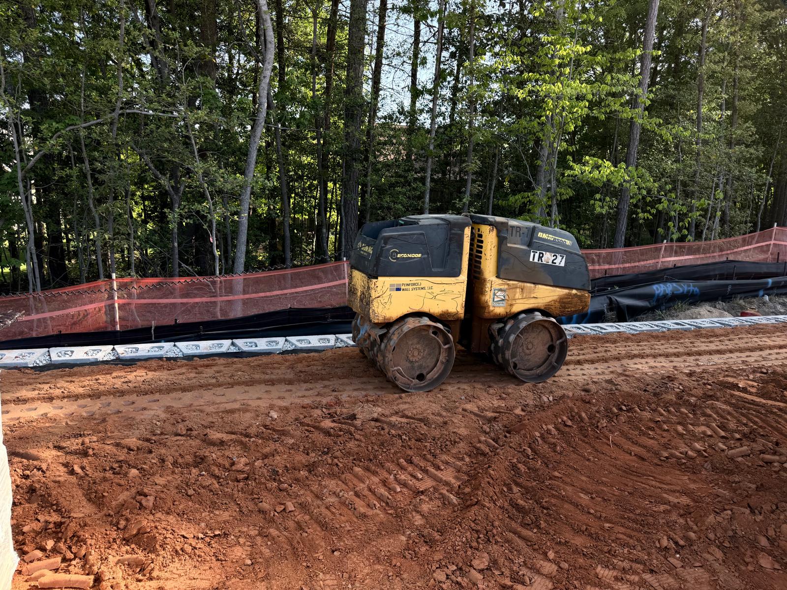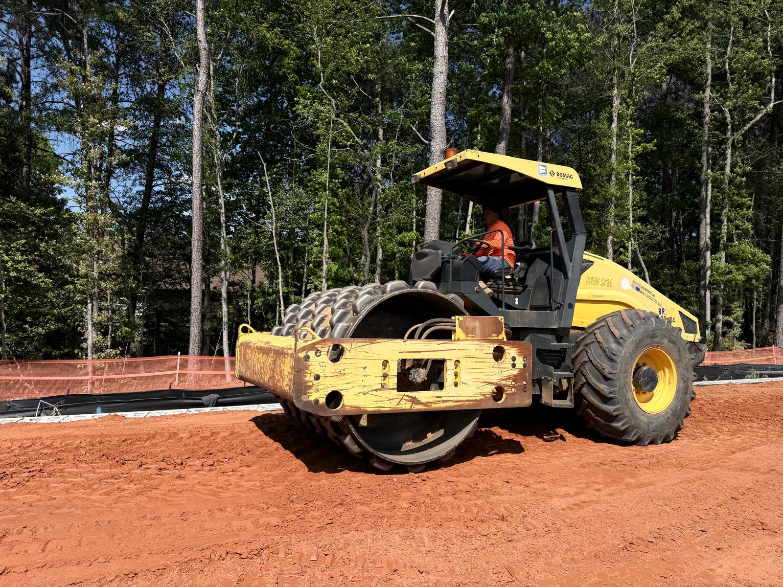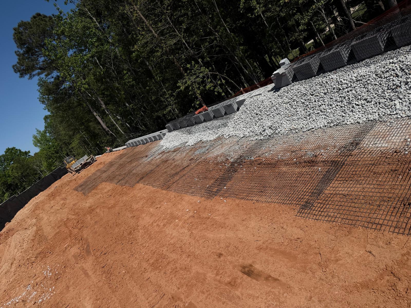 At Retaining Wall 5, the crew continued installation of CMU blocks by leveling the subgrade and placing No. 57 stone. No. 57 stone was also placed within the CMU block cores, and a fabric sheet was installed as part of the drainage and separation system. Geogrid appeared to be placed in accordance with the design requirements. The blocks appeared to be installed as per the project plans. Fill material was then placed in lifts and compacted using both a double drum roller and a sheep-foot roller.
