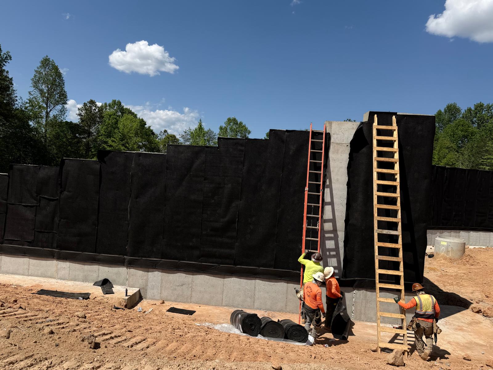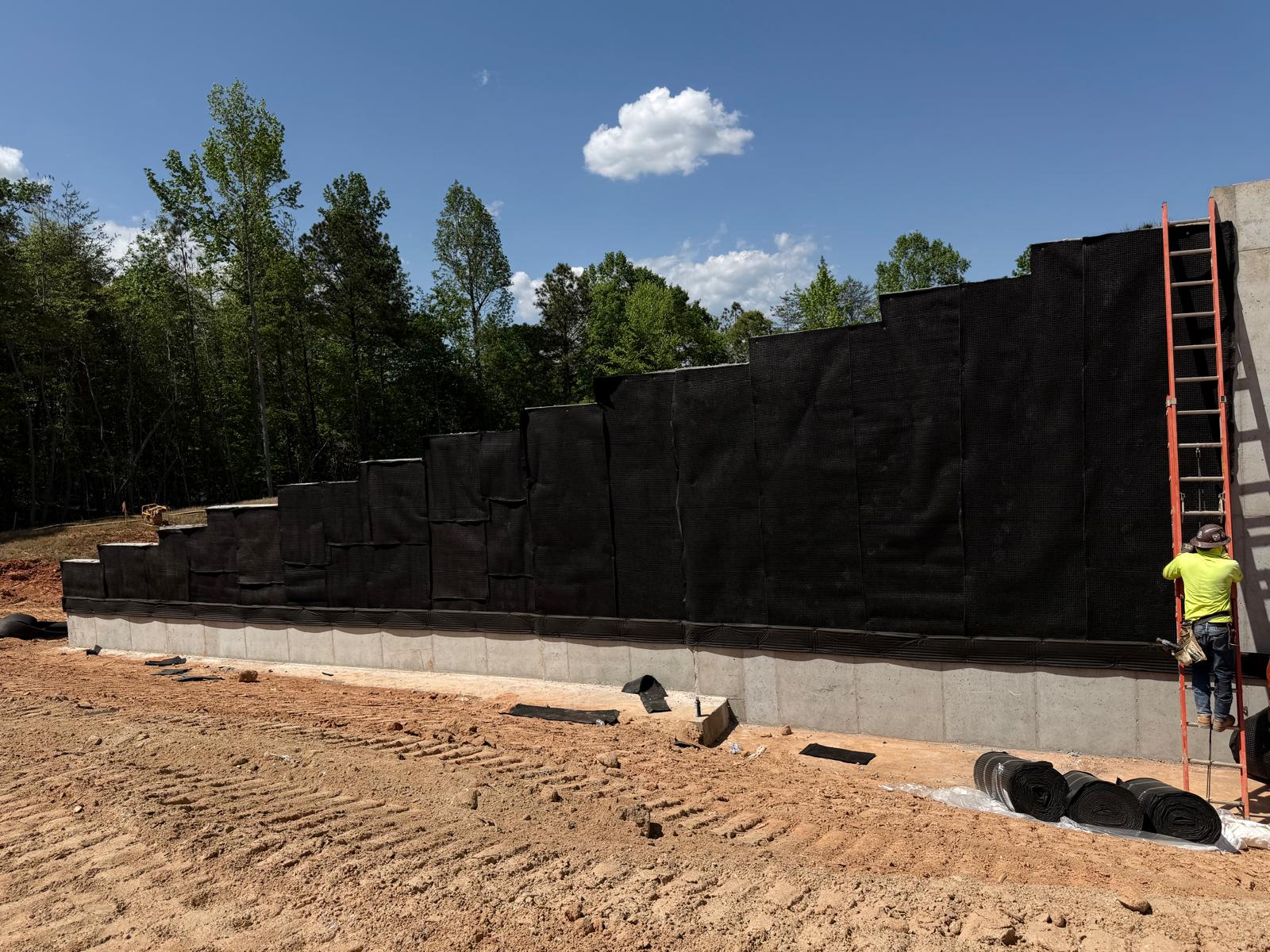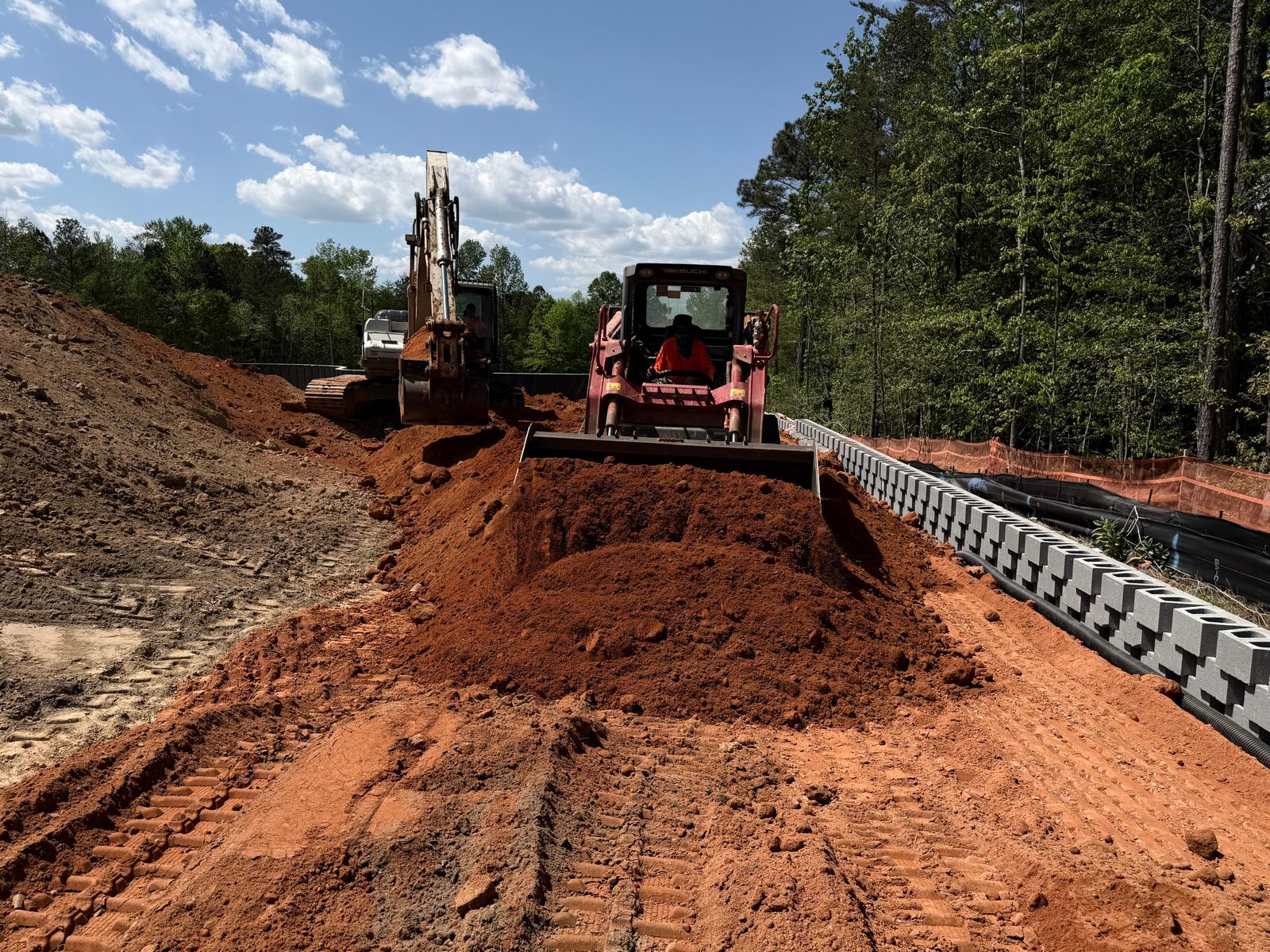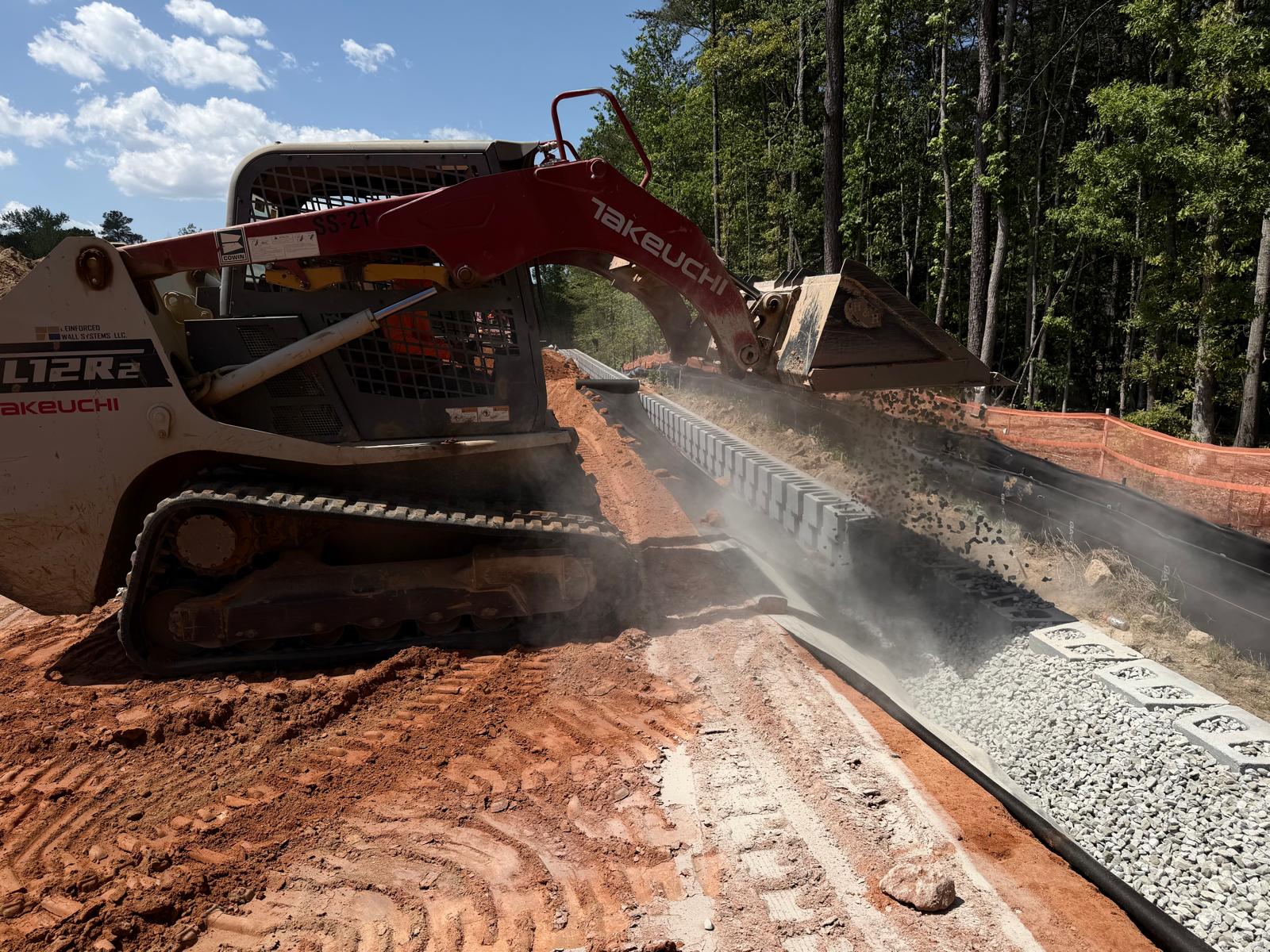At Retaining Wall 5, the crew continued installation of CMU blocks by leveling the subgrade and placing No. 57 stone. No. 57 stone was also placed within the CMU block cores, and a fabric sheet was installed as part of the drainage and separation system. Geogrid appeared to be placed in accordance with the design requirements. The blocks appeared to be installed as per the project plans. Fill material was then placed in lifts and compacted using both a double drum roller and a sheep-foot roller.