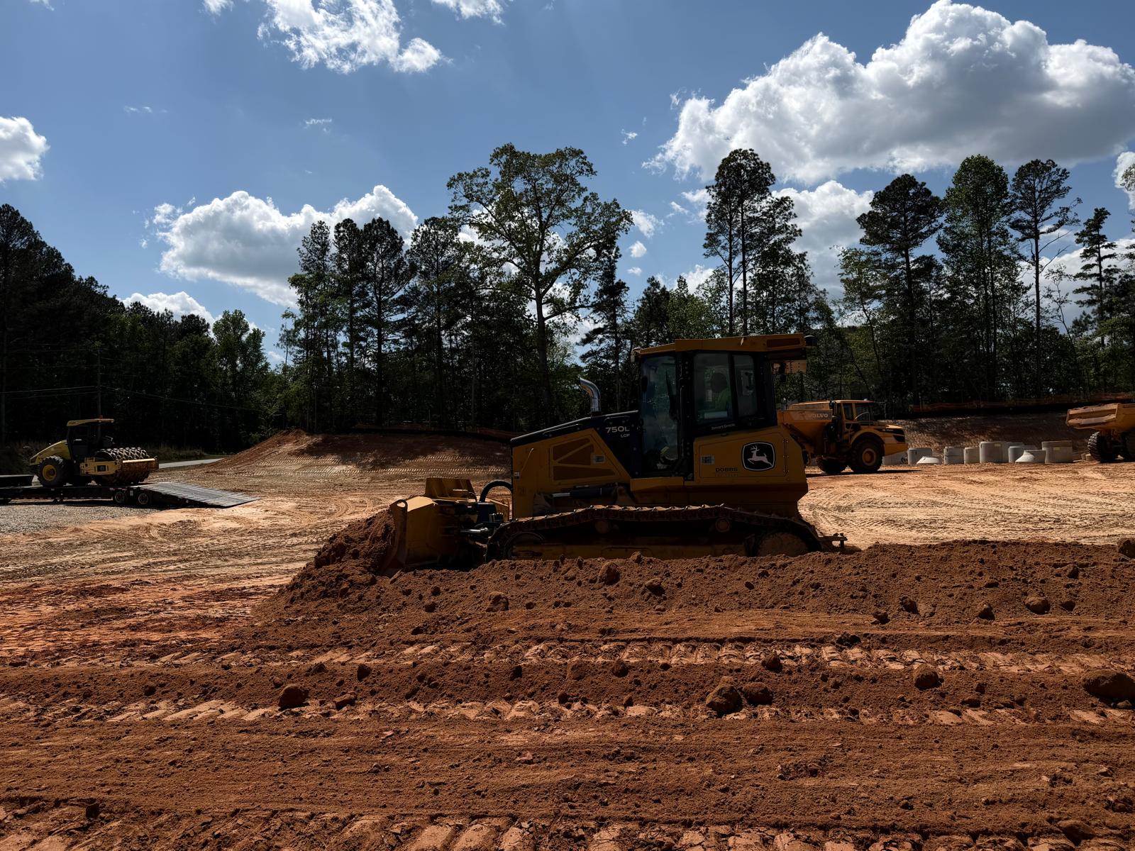 On the other side, the crew continued working on the deceleration lane, where the sub-grade was leveled, and fill material was placed in lifts using a crawler bulldozer and compacted using a sheep-foot roller.