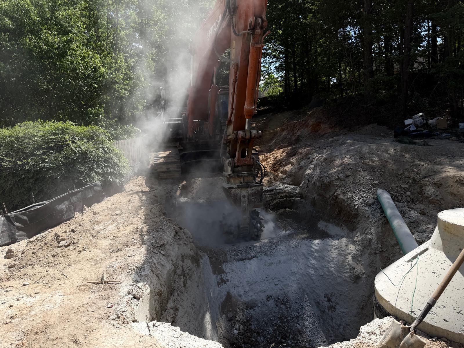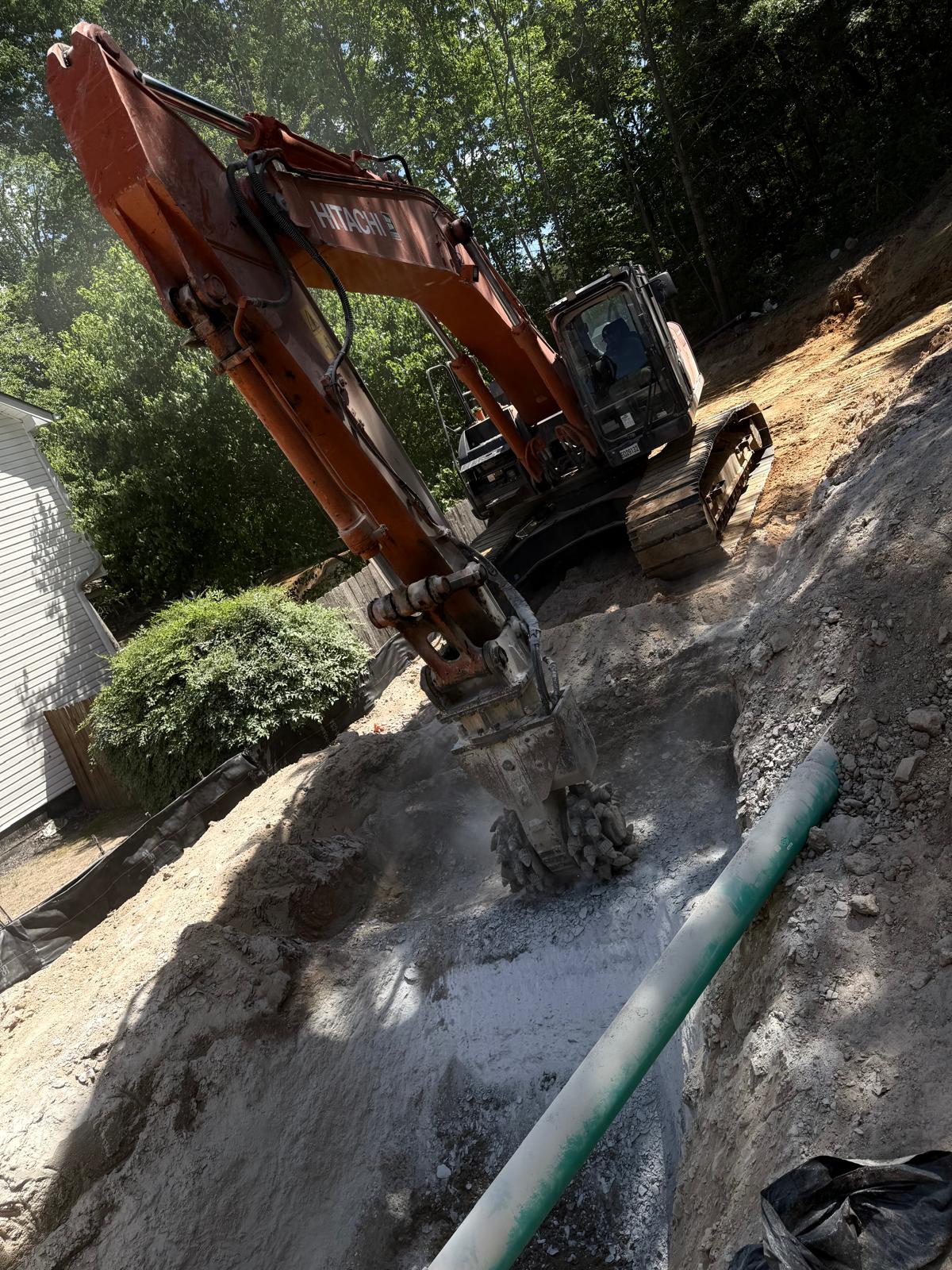 At the Buford neighborhood site, the crew continued trench excavation using a hydraulic excavator equipped with a rock grinder to achieve the required depth and wide.