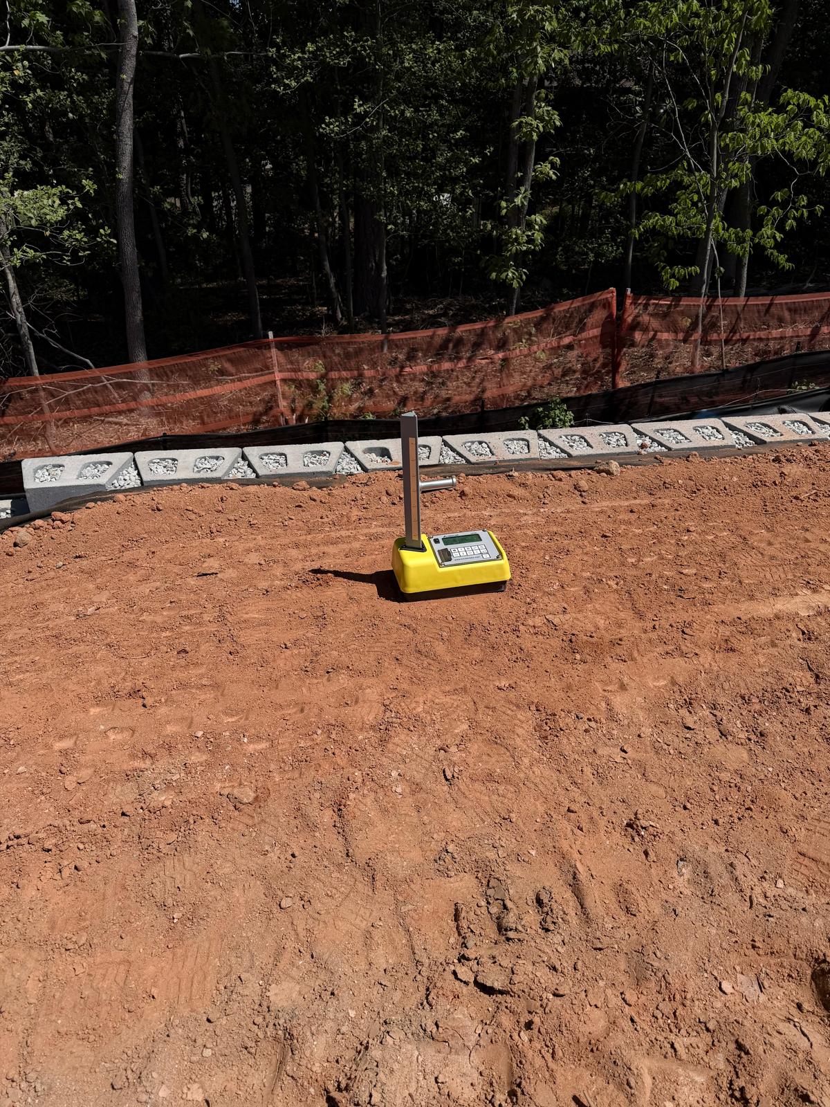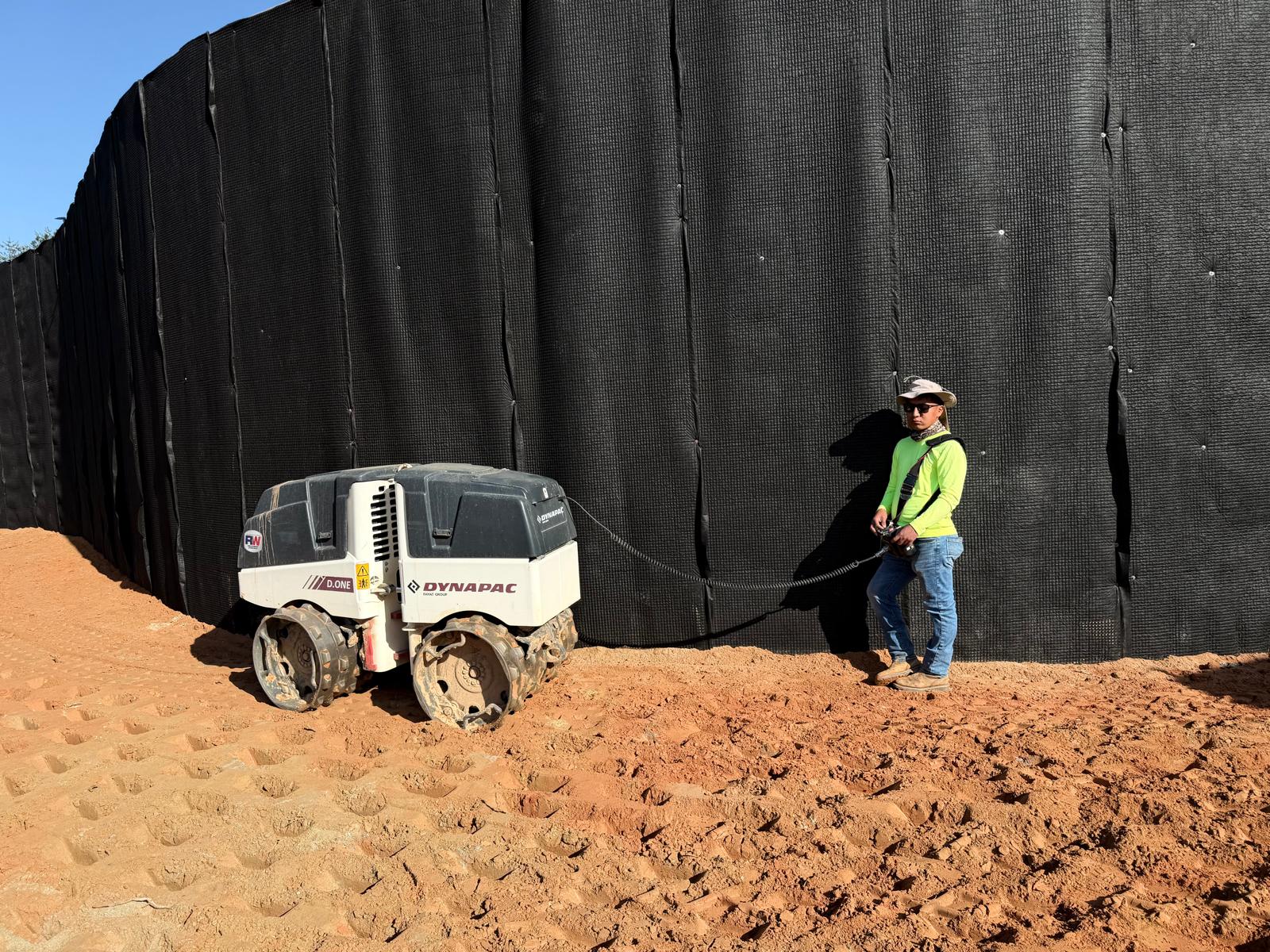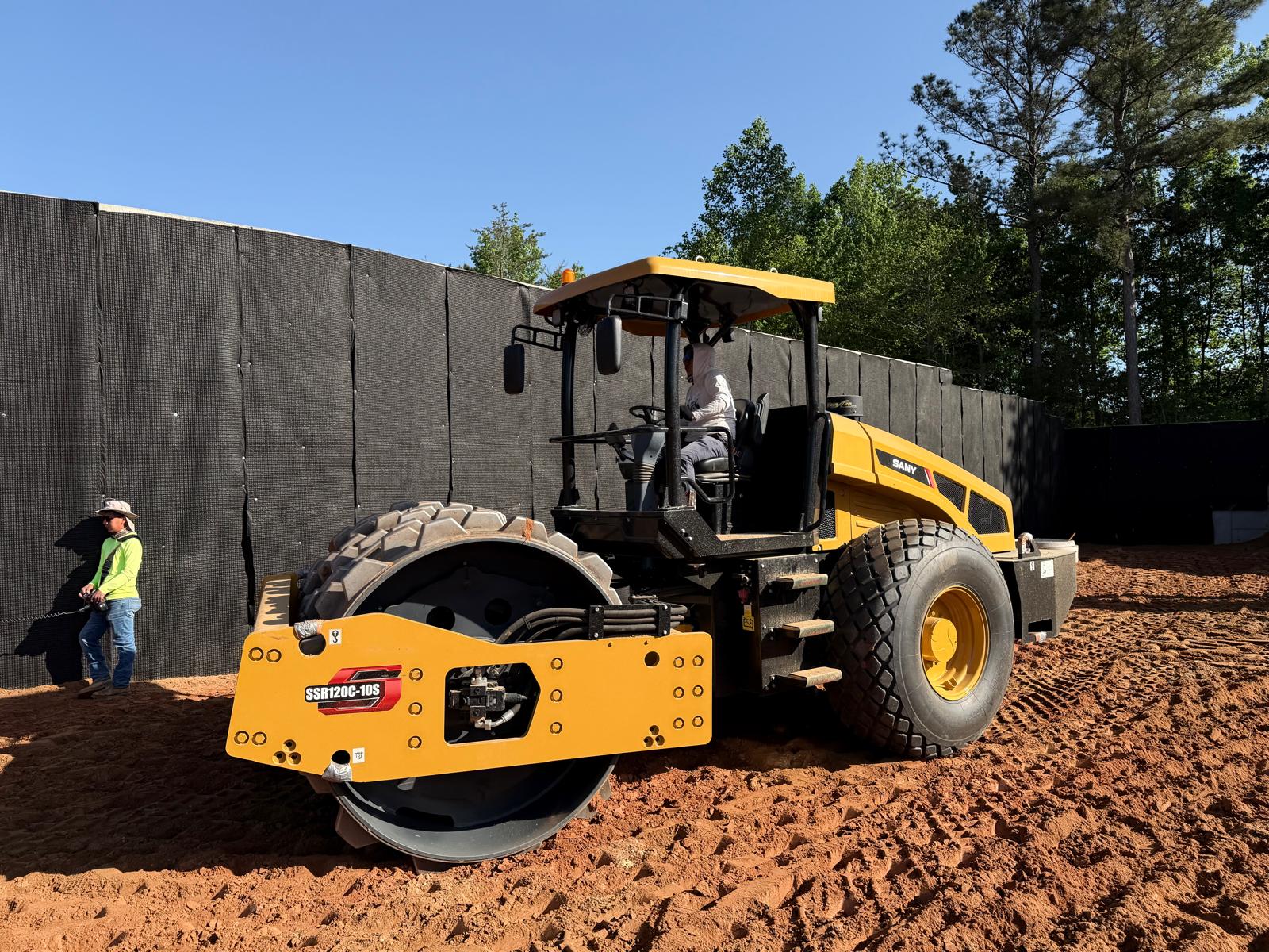 Crew continued working on the retaining wall. Manhole risers were installed as the fill material reached the required grade at each structure. Fill material was placed in lifts and compacted using a jumping jack compactor and trench compactor in areas around manholes and close to the wall. The remaining areas were compacted using both a Caterpillar 815 and a sheep-foot roller.