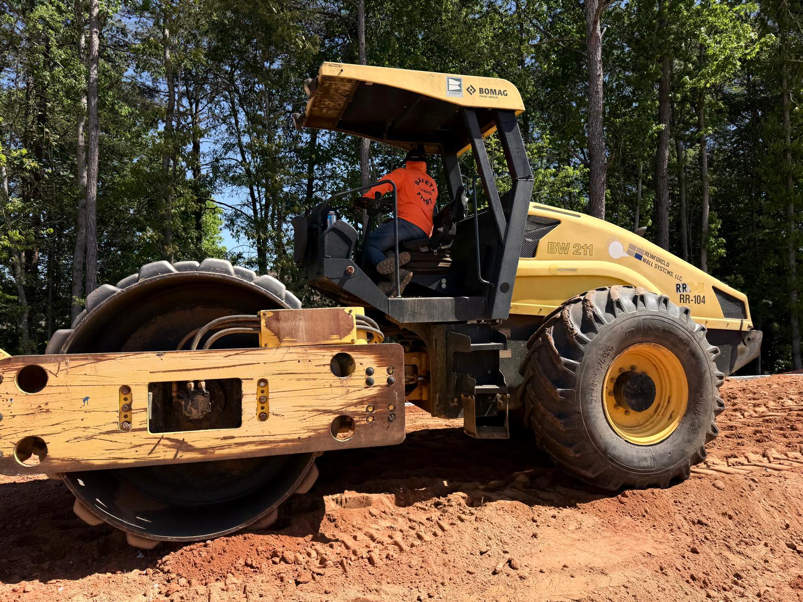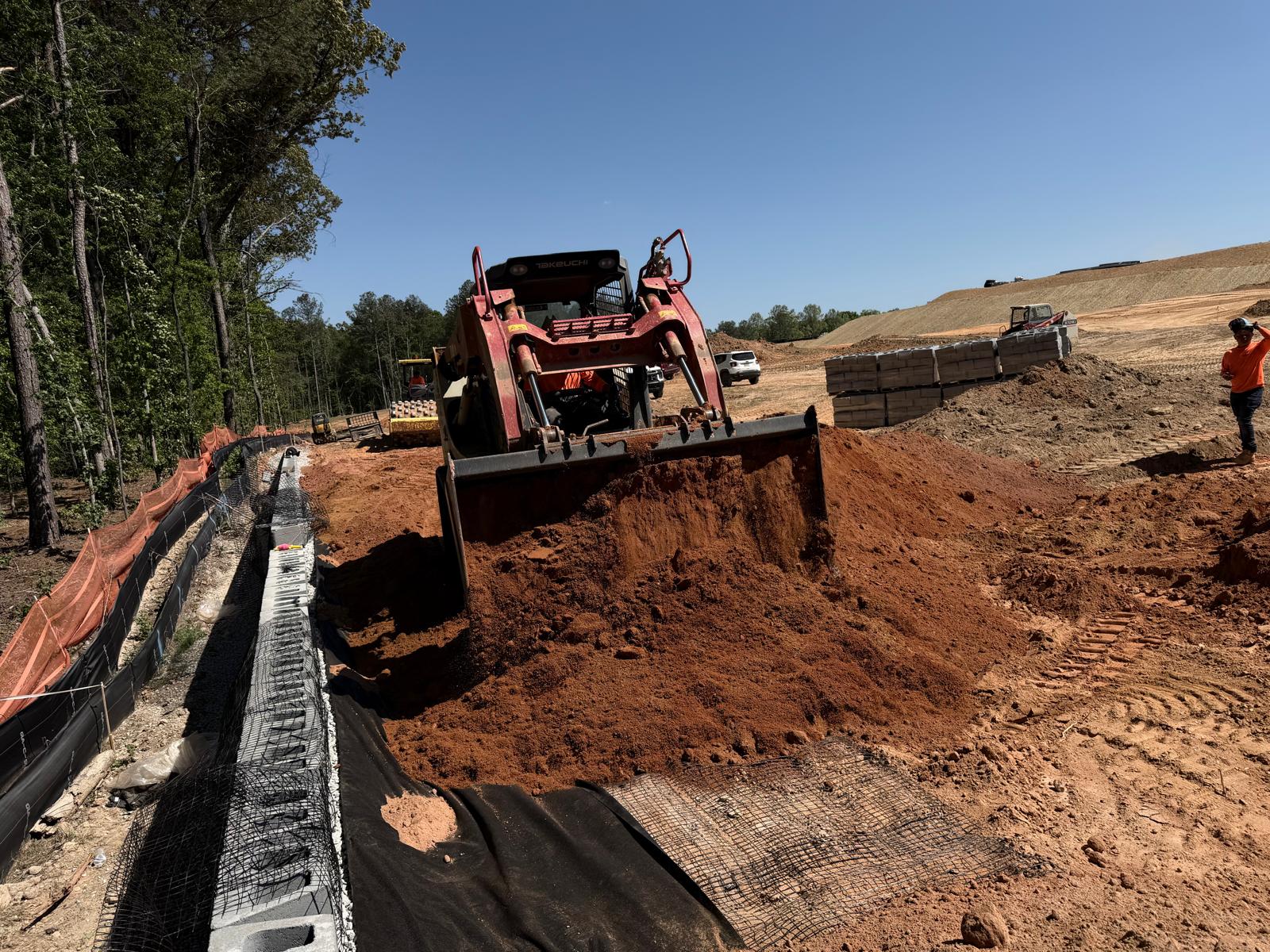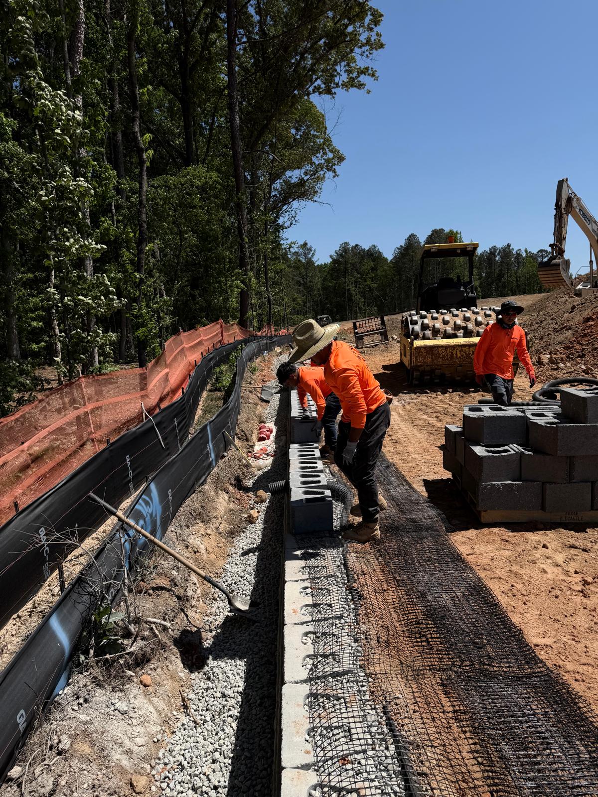 At Retaining Wall 5, the crew continued wall construction by placing CMU blocks in accordance with the project plans. Fill material was placed at the wall in lifts and compacted using a trench compactor and a sheep-foot roller.