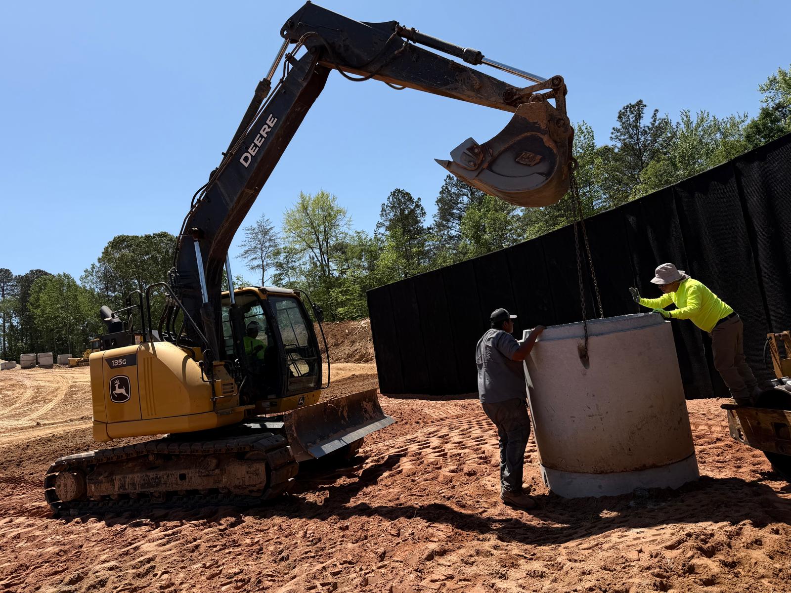At the Buford neighborhood site, the crew continued trench excavation using a hydraulic excavator equipped with a rock grinder to achieve the required depth and alignment.