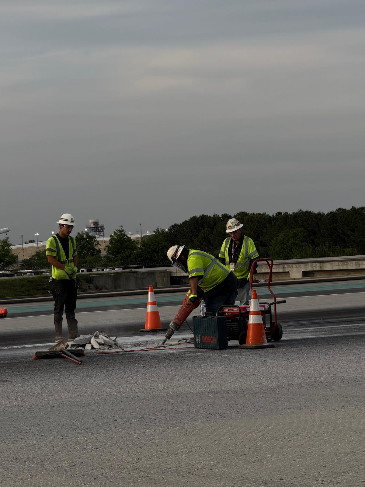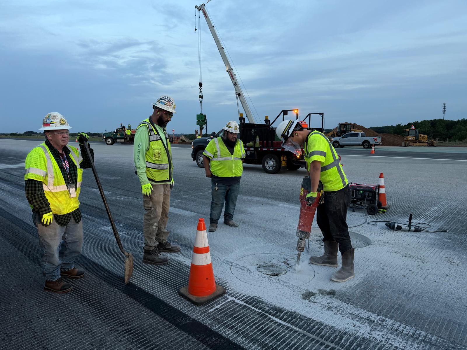Crew performing work around different manholes lids by marking and breaking a circular section of concrete using a jackhammer.