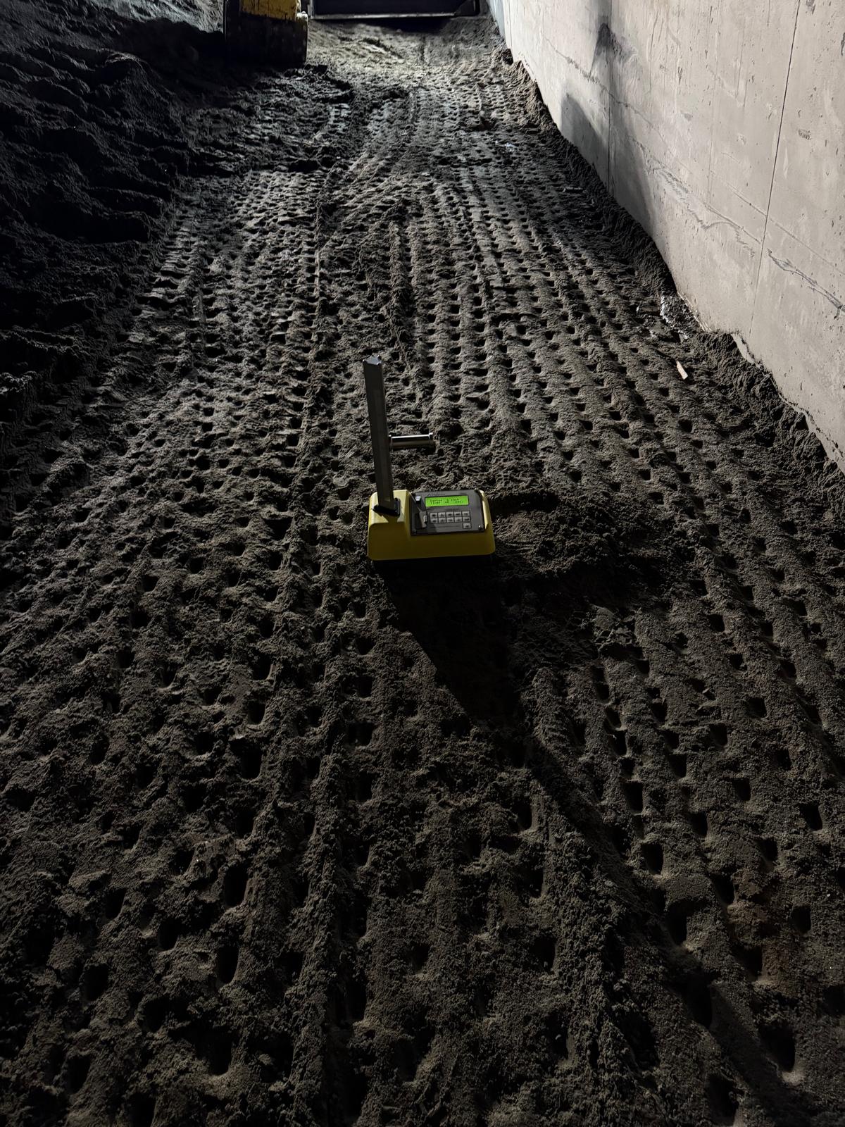 Fill material was placed and compacted using a trench compactor. However, initial compaction tests did not meet the required density. Water was added to improve moisture content, and additional compaction efforts were made. Despite reworking, the compaction still did not meet the specified requirements.