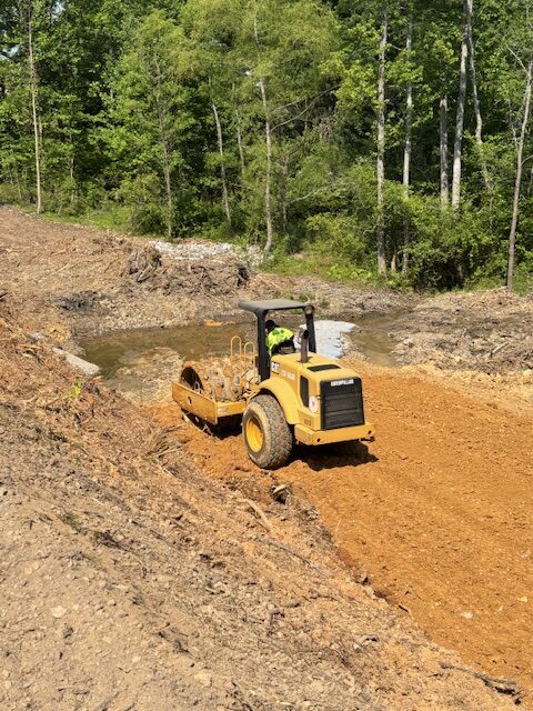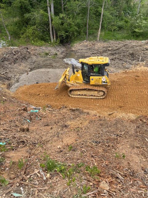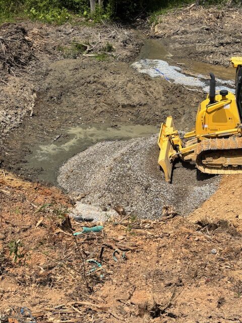 Pushing #57 stone over saturated subgrade for drainage and stabizization