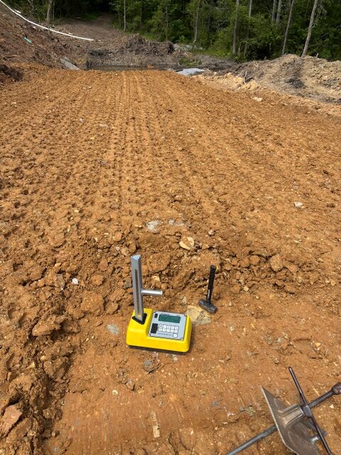 On the above date our representative was onsite to observe the grading contractor continue demucking existing subgrade soils at the west side toe of the existing dam. Groundwater was present during excavation and the contractor pumped most of the water out prior to placing two loads of No. 57 stone after excavation with filter fabric over stone as recommended. Structural fill was then placed over fabric and drainage stone in which the stone was tied into the northside drainage trench. The contractor also continued placing fill at the toe of the slope embankment starting at the east end using excavated recommended materials from the existing haul road that was drier than the onsite stockpiled materials that the contractor continues to blade for aeration. The writer performed density tests using a Troxler Nuclear gauge model 3430, serial no. 91643. The writer also performed a standard field proctor for in-place fill compacted materials. Compaction results were suitable for the requirement of 95%. It was recommended to seal off in place fill with empty off road dump truck at end of day for an anticipated rain event and to recompact with a sheep-foot roller prior to placing additional fill for surface bonding purposes.