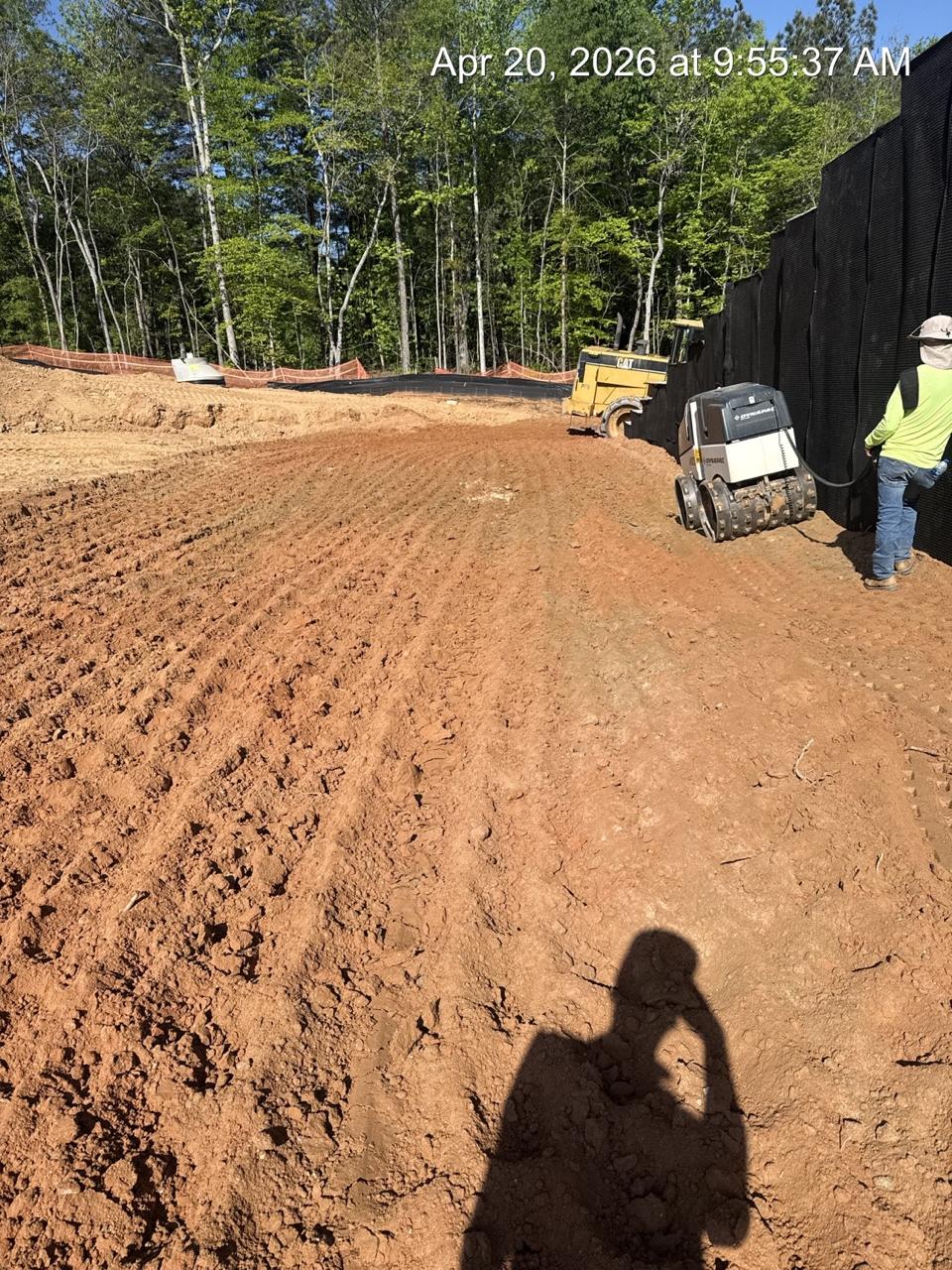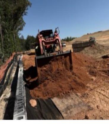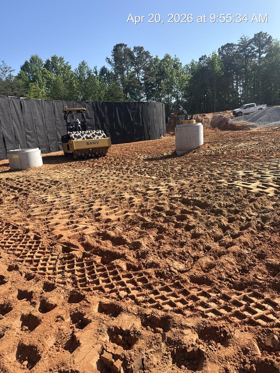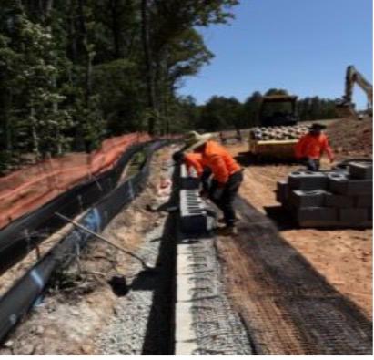 At wall 5, the crew continued wall construction by placing CMU blocks in accordance with the project plans.Fill material was placed at the wall in controlled lifts and compaccted using a trench compactor and a sheep foot roller to ensure proper stability and compaction.