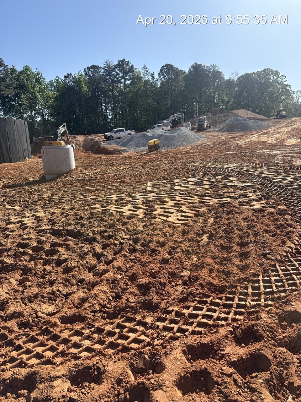 Crew continued working at the retaining wall. Manhole risers were installed as the fill material reached the required grade at each structure to maintain proper elevation. Fill material was placed in controlled lifts and compacted using a jumping jack compactor and trech compactor in area around manholes and close to the wall. The remaining areas were compacted using both a caterpillar 815 and a sheep foot roller to acheive the required density.